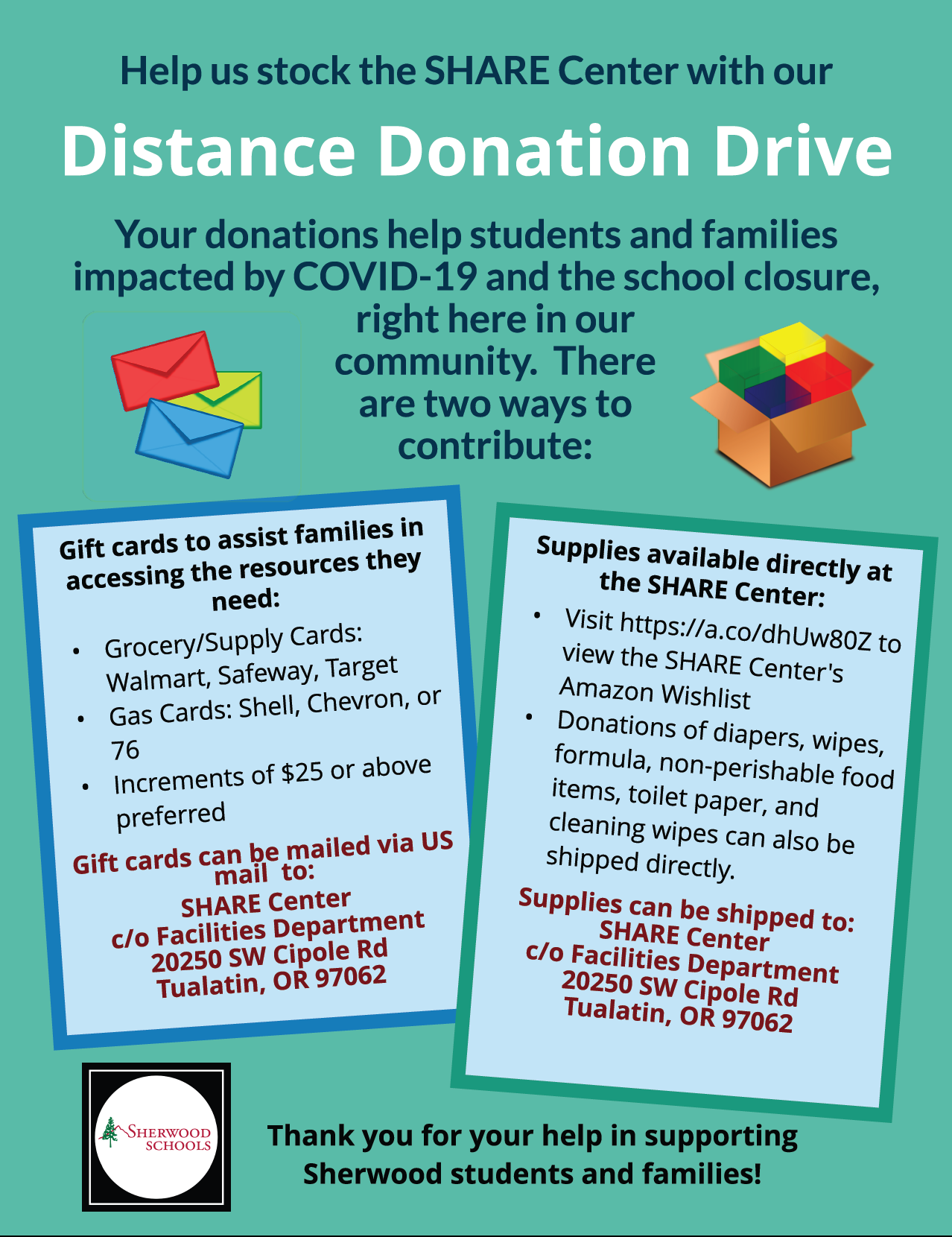 Help us keep our SHARE Center stocked during the closure! The SHARE Center provides important resources to students and families in our community, and is currently seeking donations to help sustain their services for the extent of the school closure.