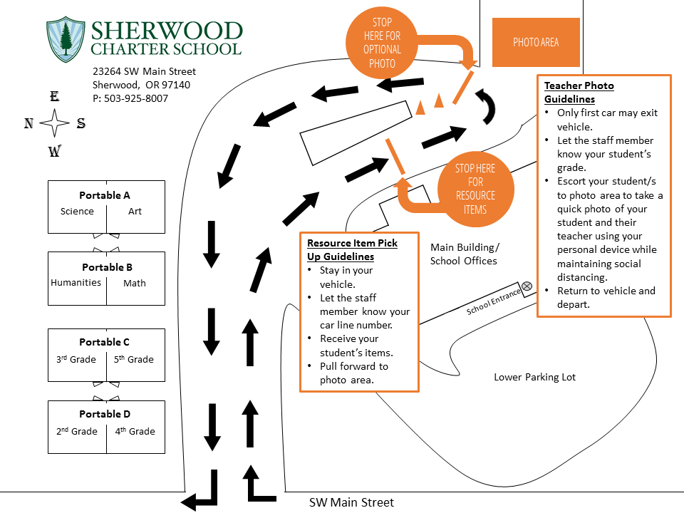 How: You will line up by vehicle using morning car line direction (see map below or click here) The first area will be to pick up student resources and a second area to have a photo taken with your student’s teacher. See the listed guidelines for each area, and please note that masks are required to be worn during this event.